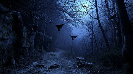 Dead cliff road on the dead mysterious forest with three crows on the night