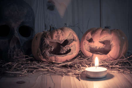 vintage tone image of rotten Halloween pumpkin with candle light and dry grass. Wooden background.