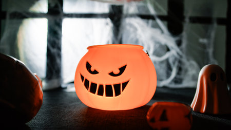 horror spooky funny ghost in halloween pumpkin holiday season greeting night celebration party with toy prop decoration and trick of treat festival concept