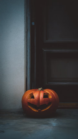 A smiling pumpkin is placed at the door illuminated softly in the dark. It brings a festive vibe to the Halloween celebration.