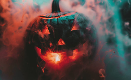 Spooky carved Jack o Lantern glowing red in thick smoke at night. Halloween background with copy space for text.