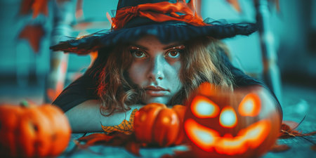 Witch holding pumpkin carved halloween horror concept, psychopomp evil wicked at dark forest with copy space the right.