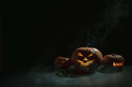 Three creepy halloween steaming pumpkins with a carved luminous smirk on a black background. A handmade jack-o-lantern head with a candle inside in the dark among the fog. Trick or treat. Postcard.