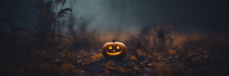 A carved pumpkin with a mischievous face glows amidst eerie fog and fallen leaves, capturing the spirit of Halloween in a dark setting.