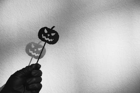 Halloween Decoration. Making Terrifying Shadow Puppet. Black paper Halloween pumpkin on a stick in hand against a white wall background. Copy space