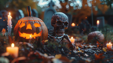 A spooky Halloween scene unfolds with a skull surrounded by pumpkins and autumn leaves Eerie and atmospheric, this cemetery-inspired decoration adds a chilling touch to any home Perfect for capturing the spirit of the season, this image evokes chills and thrills AI Generative