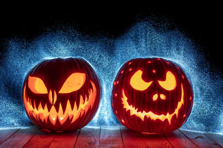 carved halloween pumpkins looking at each other, side view. wooden base and black background.