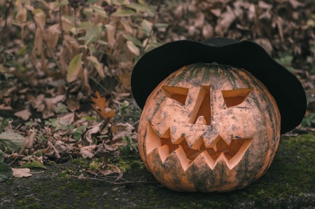 Halloween pumpkin in the forest. Spooky halloween concept.