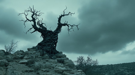 AI Generated. a dead tree in a field with a stormy sky in the background