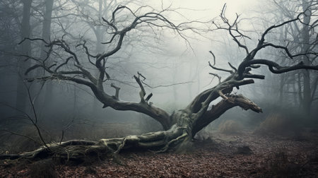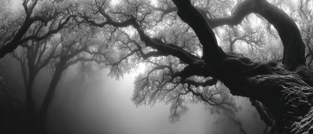 Dense fog cloaks a silent forest with sprawling branches reaching out from ancient trees creating an eerie atmosphere.