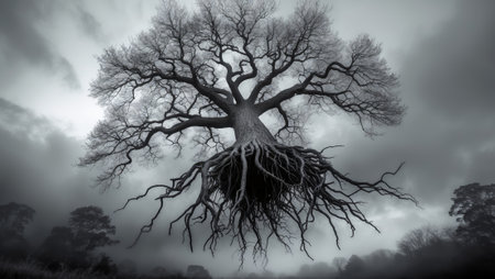 Majestic tree with exposed roots stands against a dramatic sky in a monochrome landscape