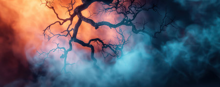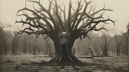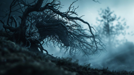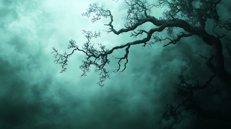 Generative AI Image of Barren Tree with Branching Twigs in Forest with Smog in Scary Nuance