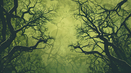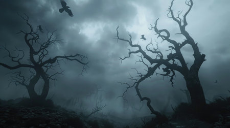 A haunting scene of an eerie foggy night, with enigmatic trees silhouetted against a dark, mysterious sky Spooky forest vibes and captivating artwork evoke the spirit of Halloween Perfect for horror lovers, haunted-themed designs, and adding a chilling touch to your visuals AI Generative
