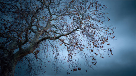 The Mulberry tree in winter, chilling air envelops, a few lingering leaves tremble, still atmosphere