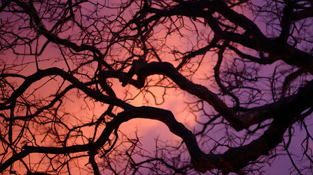 A striking silhouette of gnarled branches creates a dramatic contrast against a vibrant twilight sky filled with orange and purple hues, showcasing nature's beauty.