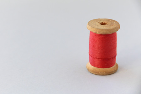 A coral spool of threads on coral paper background, with copy space. Coral color