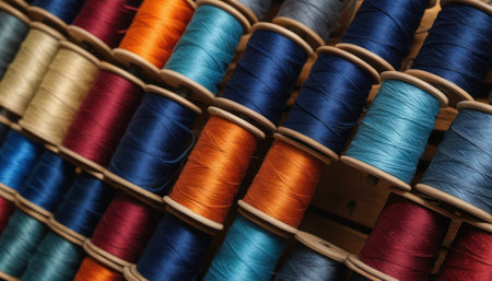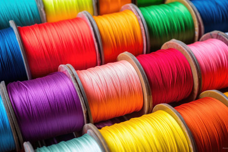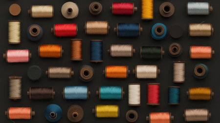 Colorful sewing threads arranged neatly on a black background, showcasing various shades for creative projects and crafts.