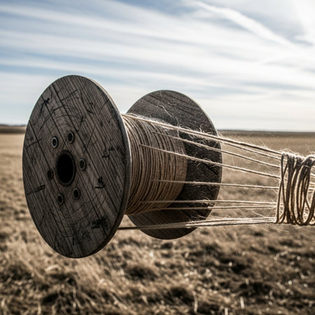 A vintage spool with copper wire lies on a textured cobblestone street, capturing the essence of an urban environment. The bright daylight highlights the scenes, blended with modern city elements in the background.
