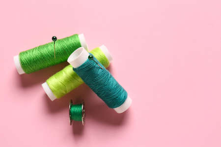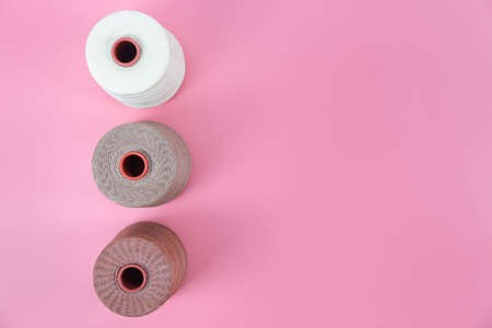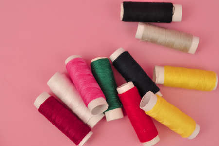 Collection of colored thread layout on a pink background. Handmade and sewing minimal concept.