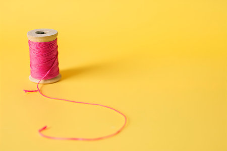 Isolated photo of a roll or a spool of red thread above and in front of a yellow background. This thread is a bit loose from the reel.