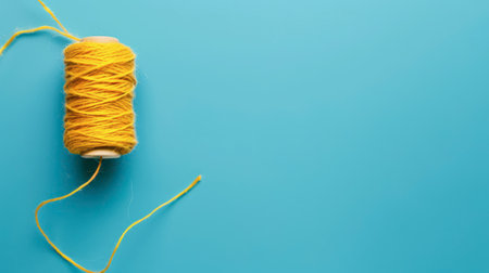 Isolated photo of a ball of light blue thread above and in front of a yellow background. This thread is a bit loose from the reel.