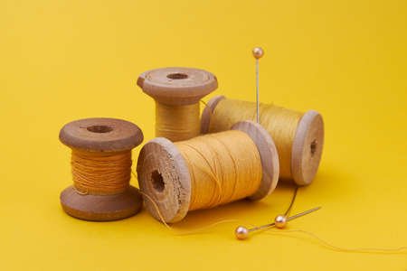 Spools of thread with different shades of yellow and pins with yellow heads on a yellow background
