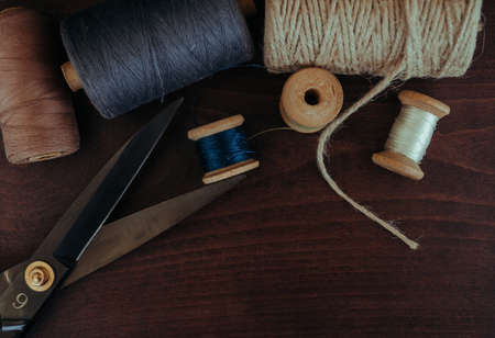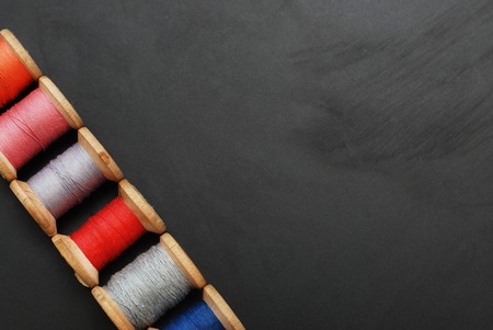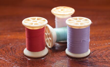 Colorful threads for sewing. Different threads on wooden vintage reels.