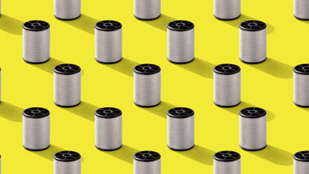 Abstract seamless pattern pop art illustration of grey threads spool on yellow background