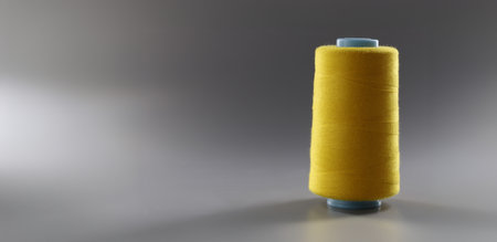 A single spool of yellow thread sits on a blue background. The thread is wound tightly around the spool and a small piece of thread extends off to the right side of the image.