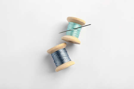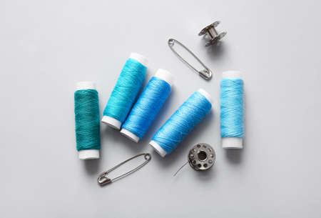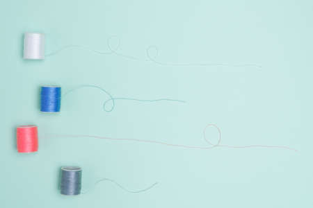 Multicolor sewing threads on a blue background with a copy space for text, concept of sewing threads