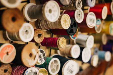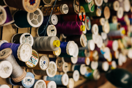 Various spools of thread in different colors hang on a wall in a crafting shop, ready for sewing projects.