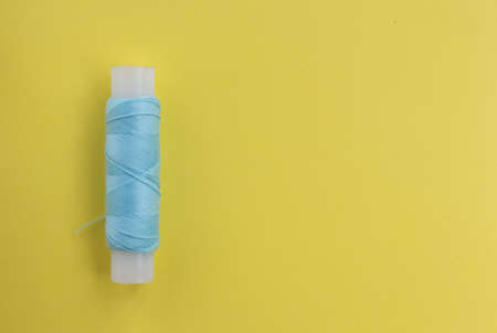 Spool of blue thread on a yellow background. Minimum, top view, flatlay.