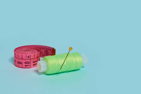 Coils with green threads, a pin and a tailor's meter on a blue background. copy space