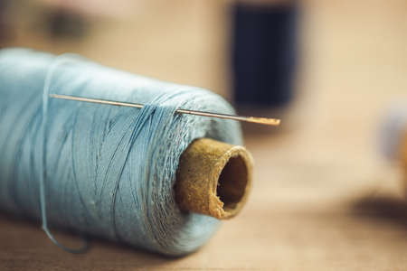 Blue sewing thread close-up with copy space. The thread is made of cotton and synthetics for the production of clothing.