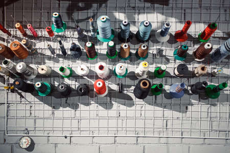 top view on closeup set of skeins of multi-colored sewing thread.Tailor industry.