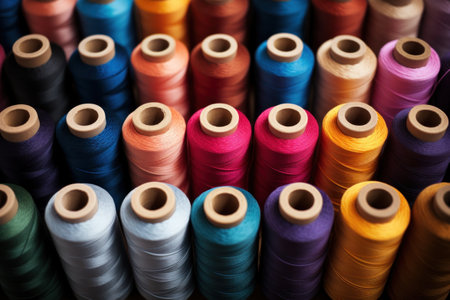 Vibrant, neatly arranged thread spools in an array of hues, highlighting detailed textures ideal for craft projects, sewing stations, and artistic ins