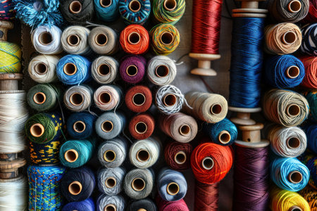 This close-up image showcases an array of colorful spools of thread, featuring various shades and textures that inspire creativity and artistry in sewing and crafting projects.