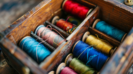 Colorful sewing in wooden box