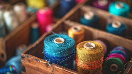 Colorful spools of thread in a wooden box. Selective focus.