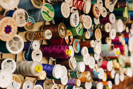 Various spools of thread in different colors hang on a wall in a crafting shop, ready for sewing projects.