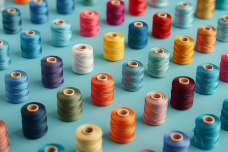 Colorful spools of thread arranged in a vibrant pattern on a blue background, showcasing various shades and textures