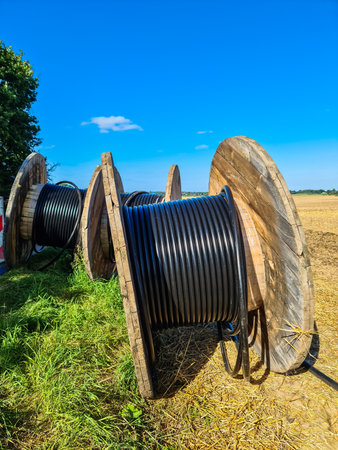 Large wooden cable drums storing electric cables are placed in a field, suggesting ongoing or planned infrastructure work under a clear blue summer sky