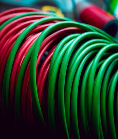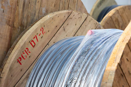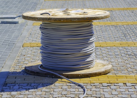 wire electric cable with wooden coil of electric cable waiting to be slipped into the conduit