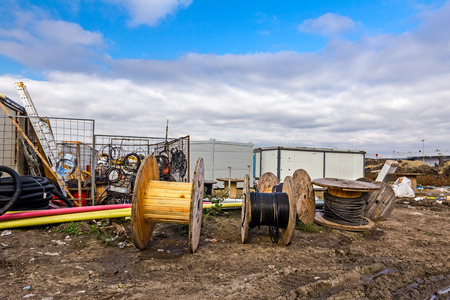 installation and protection of temporary cable providing electricity to the construction site large cable reel, selective focus