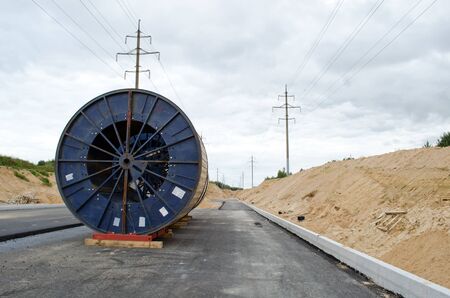 road building work and electricity line laying underground huge high voltage cable reels power line construction site