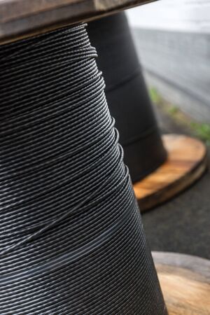 Large bobbin coil with cable wire closeup. Reel with black twisted cord