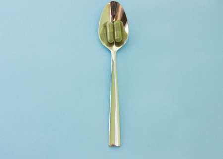 Chlorella in capsules super food. vegetable dietary Supplement Chlorella.capsules are in a spoon.