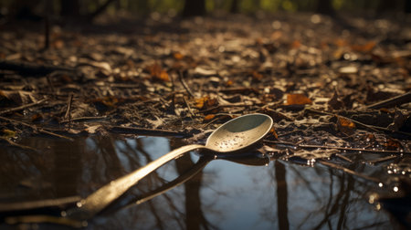 silver spoon in the mud at sunset, capturing the essence of fairytale-inspired woodland imagery. this atmospheric portrait showcases hidden meanings within the forestpunk aesthetic, enhanced by the delicate water drops on the spoon. the whistlerian influence and the use of a leica i camera add a touch of vintage charm to this enchanting composition. ai generated