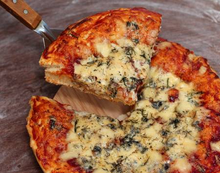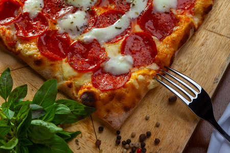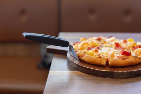 Close up on sliced baked pizza on the table at home or restaurant on the board top view