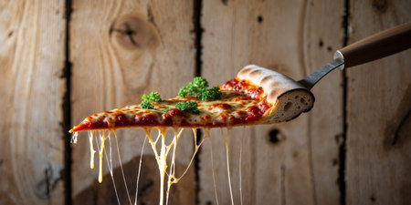 AI Generated. Rustic wooden backdrop with mouthwatering pizza slice lifted with gooey cheese